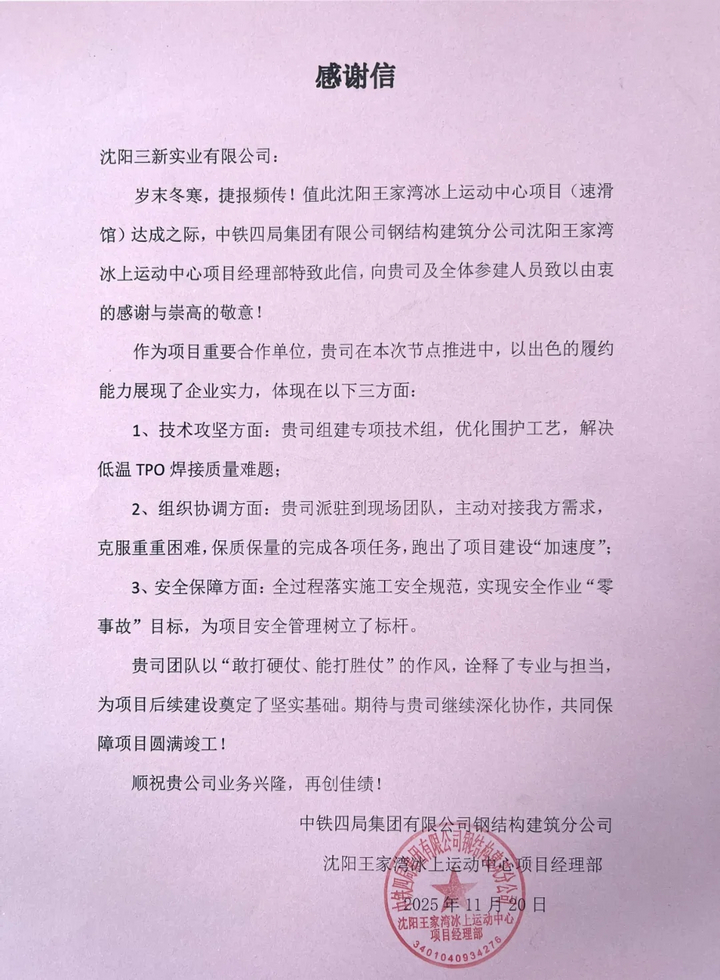 日前,中鐵四局項目部的感謝信跨越金秋而來,字里行間滿是對三新的敬意:“技術攻堅破局、組織協調高效、安全保障扎實,以‘三新力量’為場館如期封閉筑牢根基?!?/span>這紙贊譽背后,是汗水與堅守的沉淀,更是對東北建筑鐵軍匠心與實力的最佳詮釋。